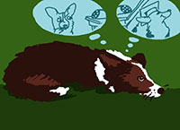 Так получилось, что после первого урока у меня были всякие авралы на работе, даже командировки. Поэтому в школу я попасть не могла и целый месяц мы просто гуляли, ходили рядом, учили команду "ко мне". Несколько раз не срабатывало, слишком был увлечен собачкой или метками. Тогда я спокойно уводила его домой. Учились лежать рядом и на расстоянии. Почти каждый раз видно, что думает: "А надо ли это делать? Ну ладно, лягу". А хочется, чтобы падал, нам эта четкость очень нужна на пастушке.