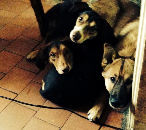 на фото - справа - мой овчареныш, слева внизу такса№1 (мужик)), а сверху такса №2 (даже на фото видно, что мордаха заискивающая, или это только я вижу?)))