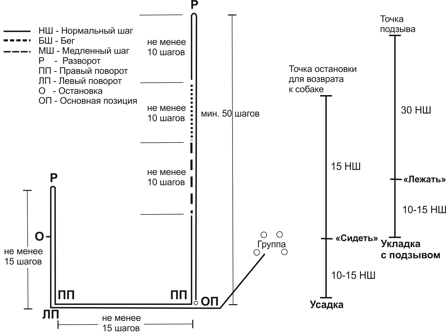 - встречаемся в центре – команда ЛЕЖАТЬ – отойти от своей собаки на два шага – далее позвать командой КО МНЕ и вернуться на и.п. - отлично