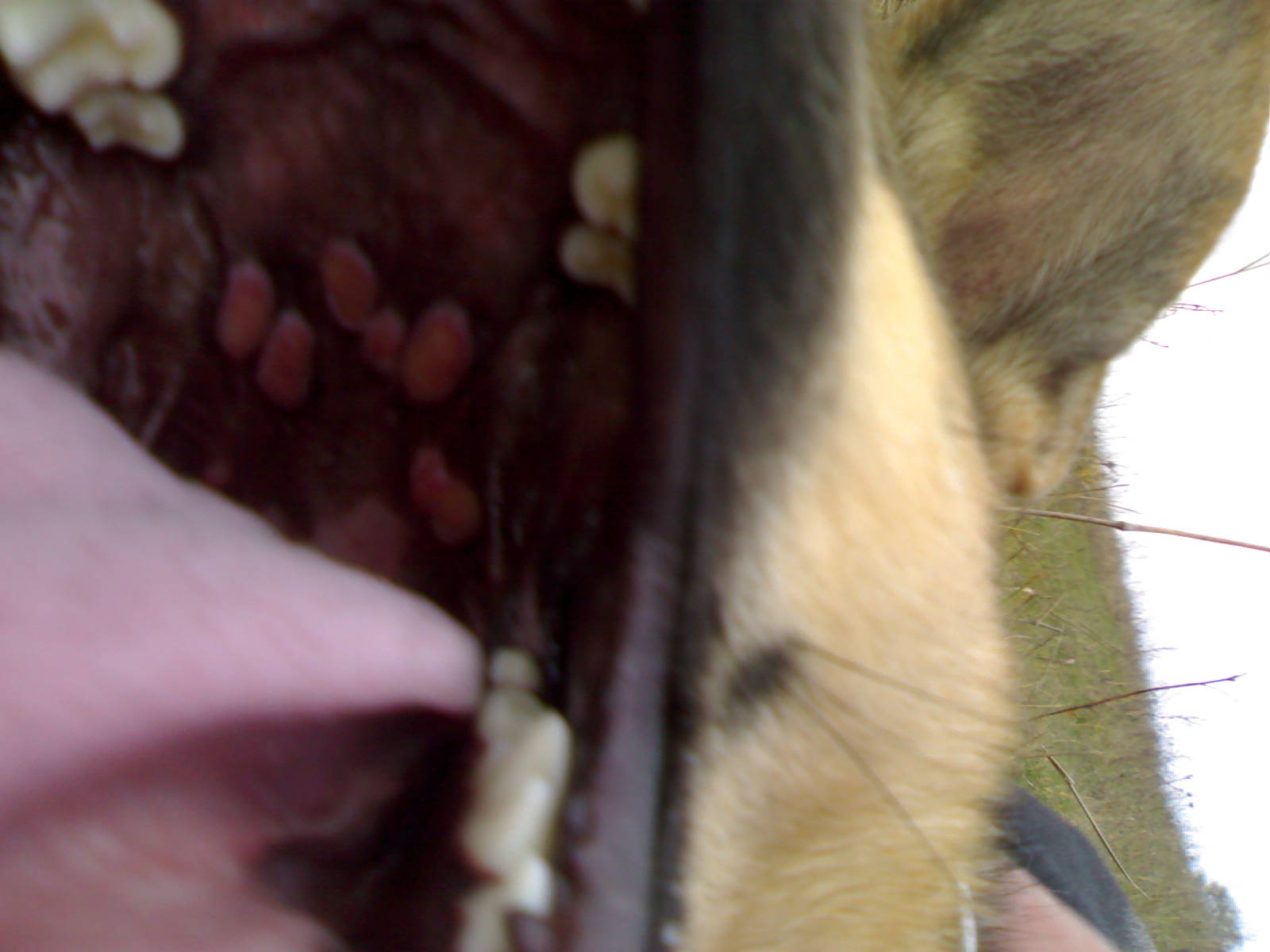 Добрый день!проблема с собачкой. Девочка, 1 год, порода Восточноевропейская овчарка. Месяцев в 6-7 на нёбе почти у глотки появилось пятнышко, вроде язвы, но не очень похоже. Сейчас, к году, их уже 6. Собака чувствует себя хорошо, не вялая, температуры нет, повышенного слюноотделения тоже нет, да и вообще ничего её не беспокоит. Иногда может не покушать, ест с неохотой (хотя кошачьи миски объедает влёт ). Подскажите пожалуйста, что это может быть? Или вариантов очень много?
